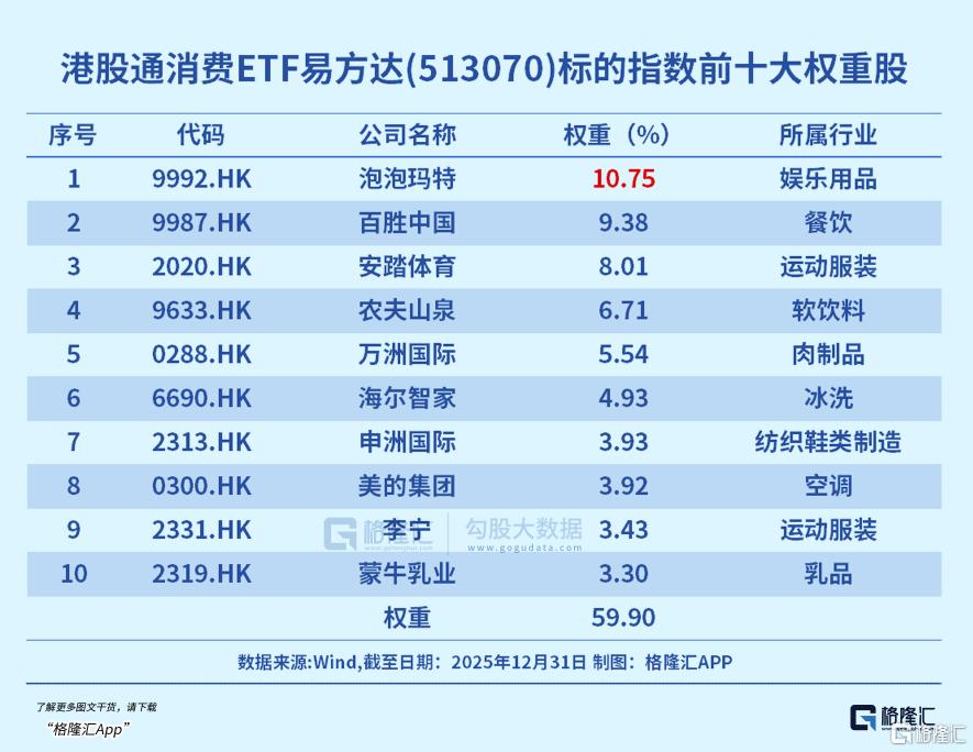 这些赛道也是港股通消费ETF易方达(513070)标的指数聚焦的赛道,权重股包括泡泡玛特、百胜中国、安踏体育、农夫山泉等纯消费龙头,其中泡泡玛特为第一权重股,占比10.75%,是全市场泡泡玛特含量最高的ETF。