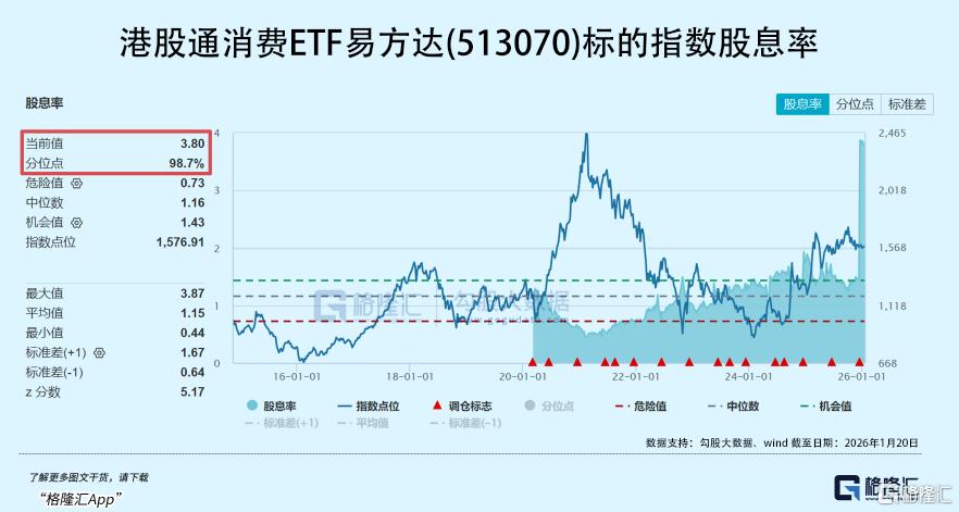 用一些有代表性的消费指数,如港股通消费ETF易方达(513070)及其联接基金(A类018103/C类018104)跟踪的中证港股通消费主题指数为例,目前市盈率为17.35倍,处于上市以来0.65%分位,比过去99%的区间低;股息率为3.8%,比过去98.7%的区间都高。