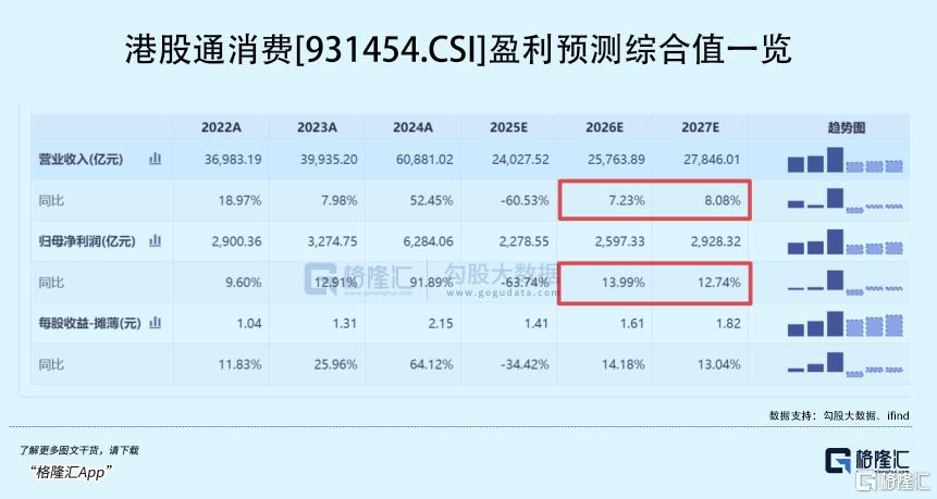 根据主流券商的一致预期,中证港股通消费主题指数(成分股),在2026、2027年的营收和净利润增速,预计将恢复正增长,且净利润的增速要高于营收增速,展现企业降本增效的效果。