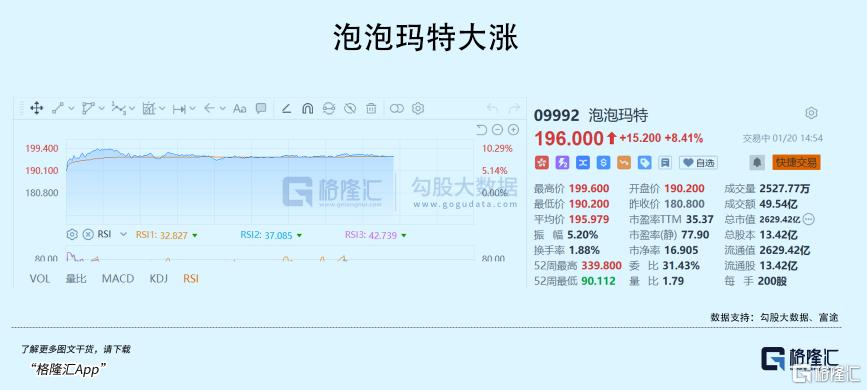 盘面上,科网股普跌,石油股、内房股也普遍低开,但泡泡玛特这类消费股,却逆势高开逾5%,并全天维持强势,股价盘中一度涨超10%。