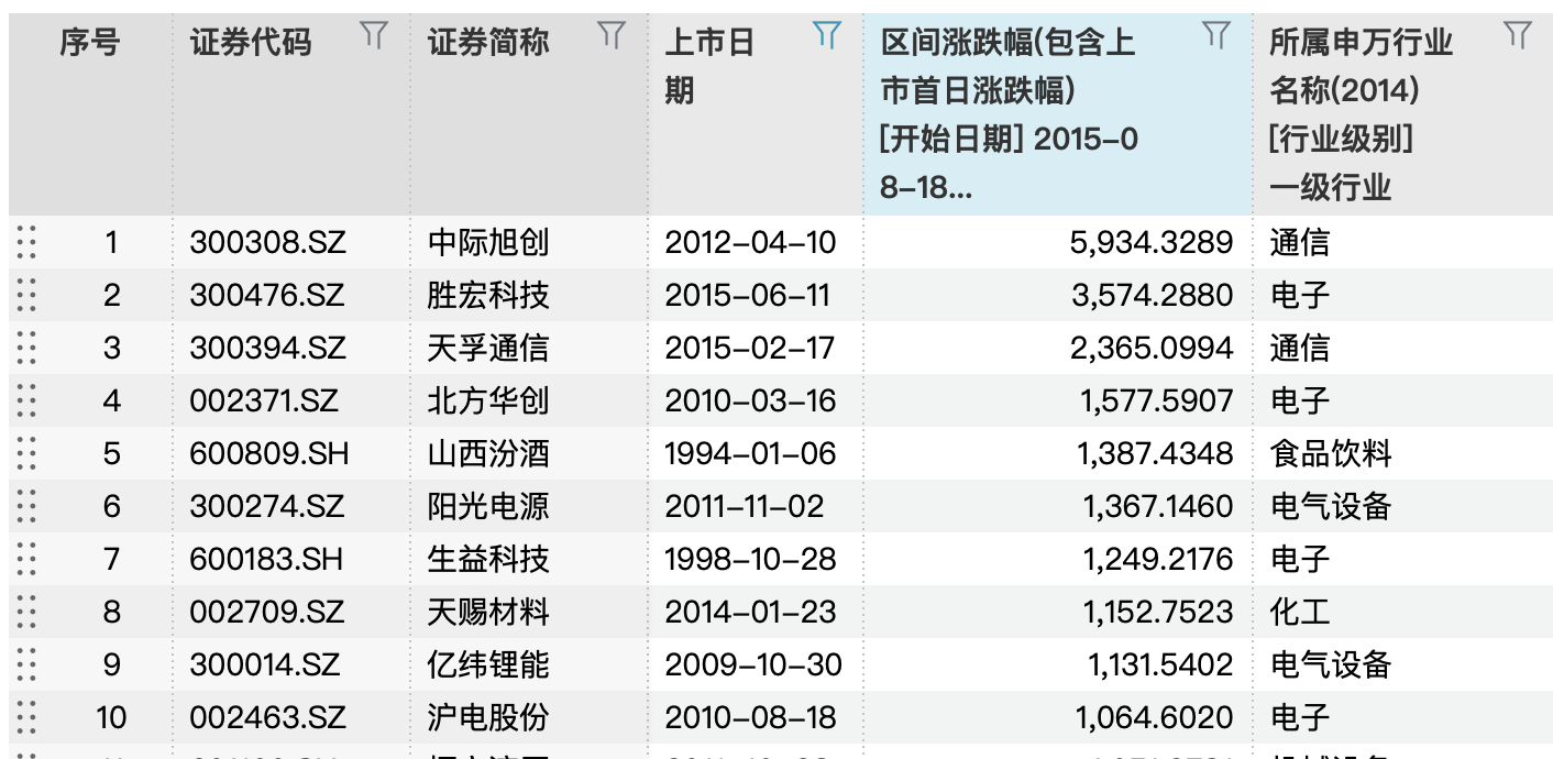 时代财经梳理发现,自2015年沪指高点以来的10年间,2015年8月18日前上市的个股中,(截至2025年10月28日收盘)涨幅前10的标的涨幅均超10倍。其中,中际旭创(300308.SZ)、胜宏科技(300476.SZ)、天孚通信(300394.SZ)涨幅居前三,电子、通信、电气设备三大行业占比达 80%,印证了科技板块的长期成长逻辑。