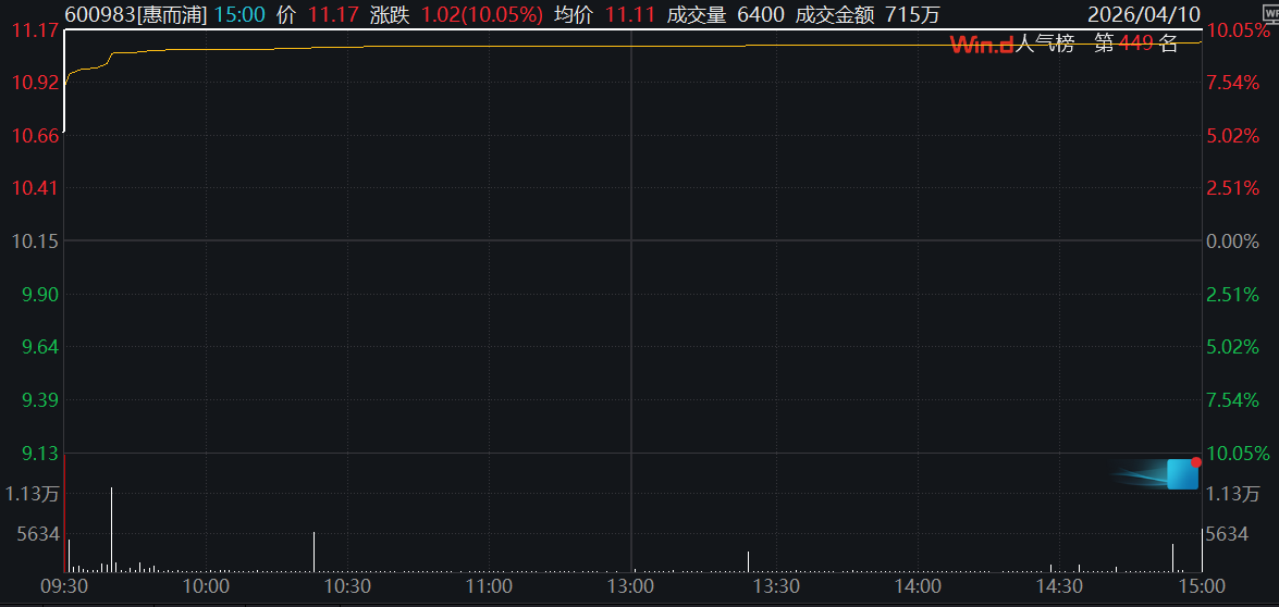 4月10日,惠而浦的股价高开后很快涨停,截至收盘报收11.17元/股,总市值涨至86亿元左右。