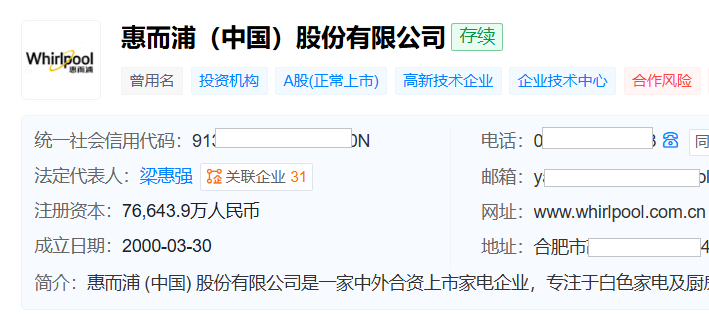 天眼查显示,惠而浦成立于2000年3月,前身为合肥荣事达三洋电器股份有限公司(下称“合肥三洋”),位于安徽省合肥市,2004年7月在上交所主板上市,是一家洗衣和厨房解决方案供应商,产品涵盖洗衣机、冰箱、洗碗机、干衣机以及厨房电器、生活电器等全品类。