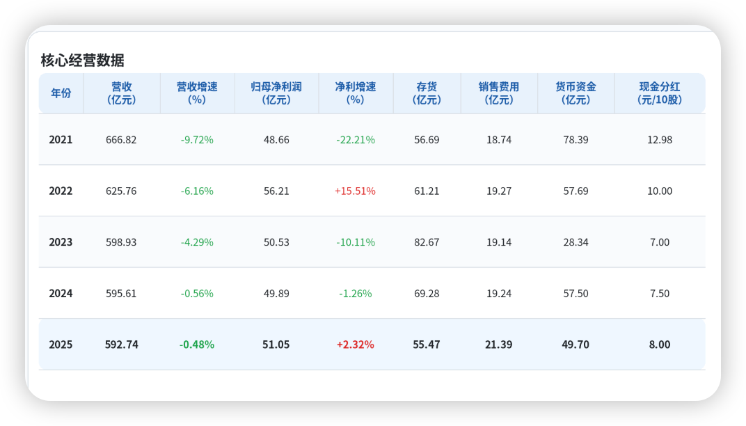 3月24日晚间,双汇发展披露2025年年度报告。报告期内,公司实现营业收入592.74亿元,同比下降0.48%;归属于上市公司股东的净利润51.05亿元,同比增长2.32%。公司拟向全体股东每10股派发现金红利8元(含税),合计分红约27.72亿元,延续了其上市以来一贯的高分红传统。