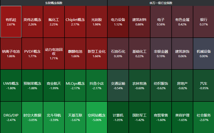 分行业来看,电力设备、建筑材料、电子、有色金属、银行等行业领涨,社会服务、美容护理、商贸零售等行业领跌。