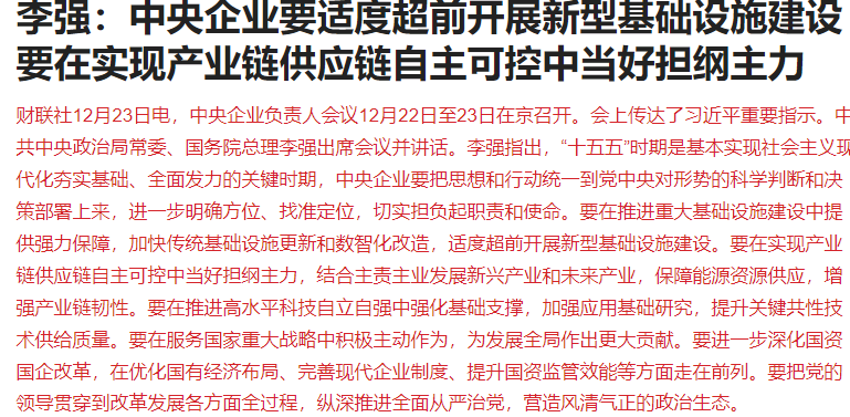 李强:中央企业要适度超前开展新型基础设施建设 要在实现产业链供应链自主可控中当好担纲主力。