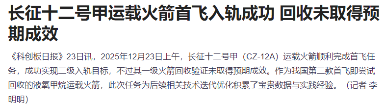 据报道,2025年12月23日上午,长征十二号甲(CZ-12A)运载火箭顺利完成首飞任务,成功实现二级入轨目标,不过其一级火箭回收验证未取得预期成效。A股商业航天板块退潮,顺灏股份、华体科技等多股跌停。