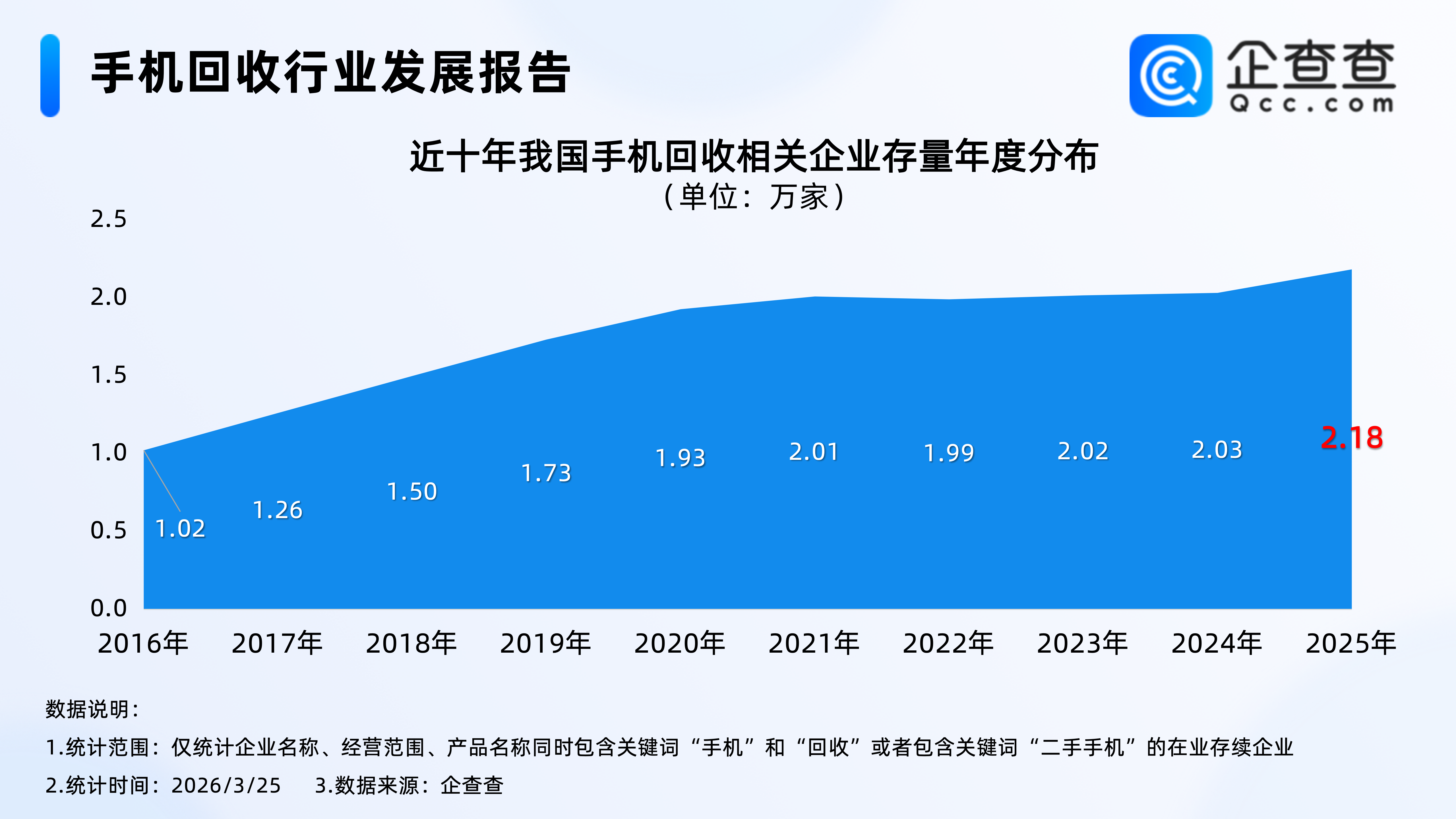 企查查数据显示,近十年,我国手机回收相关企业存量从2016年的1.02万家,逐年增加至2021年的2.01万家,此后年度每年企业存量保持在2万家左右。截至2026年3月25日,我国现存2.2万家手机回收相关企业。