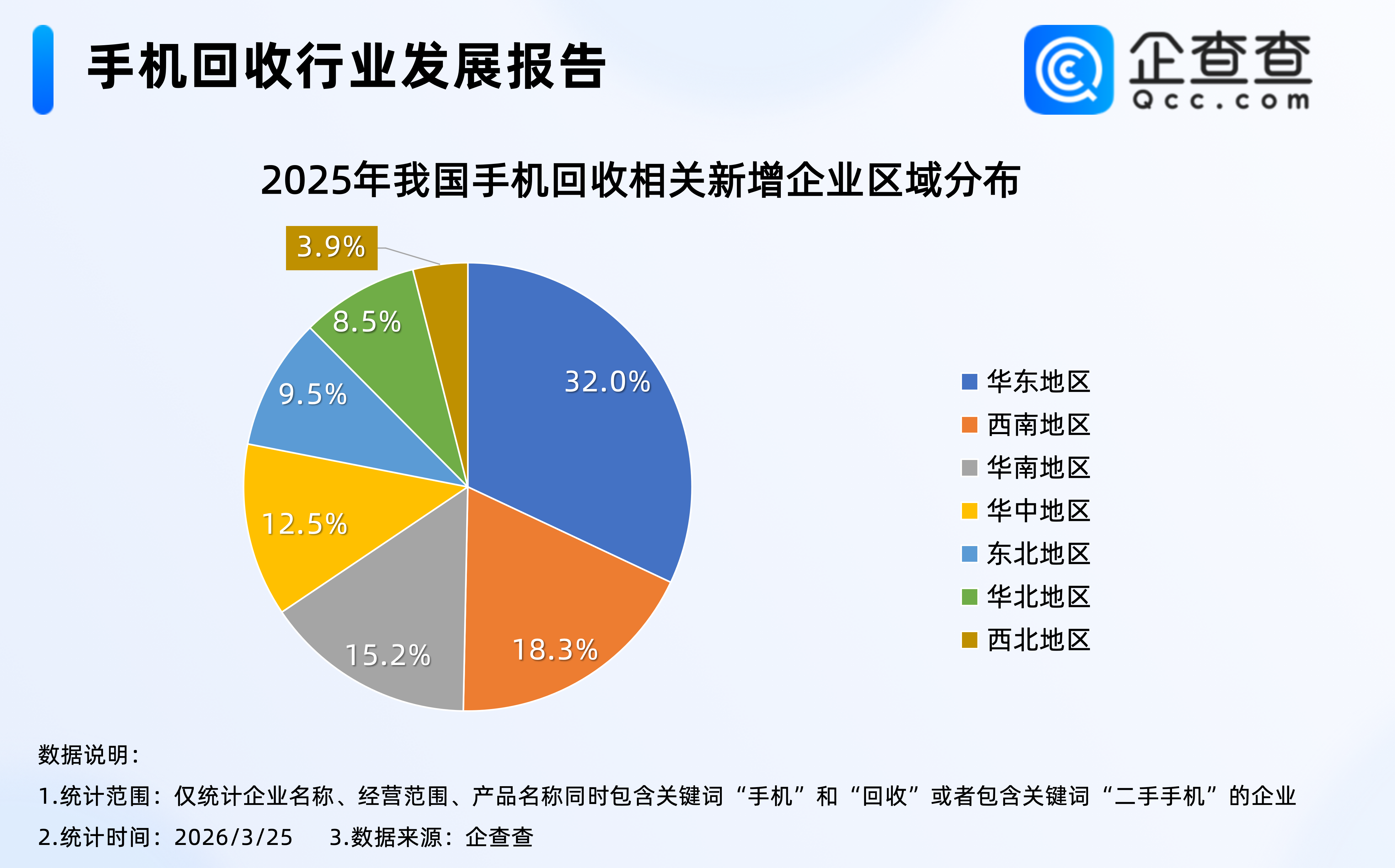 企查查数据显示,2025年新注册的2663家手机回收相关企业中,分布在华东地区的相关企业最多,占比32.0%,其次是西南地区,占比18.3%,华北、西北地区占比相对最少,分别为8.5%、3.9%。