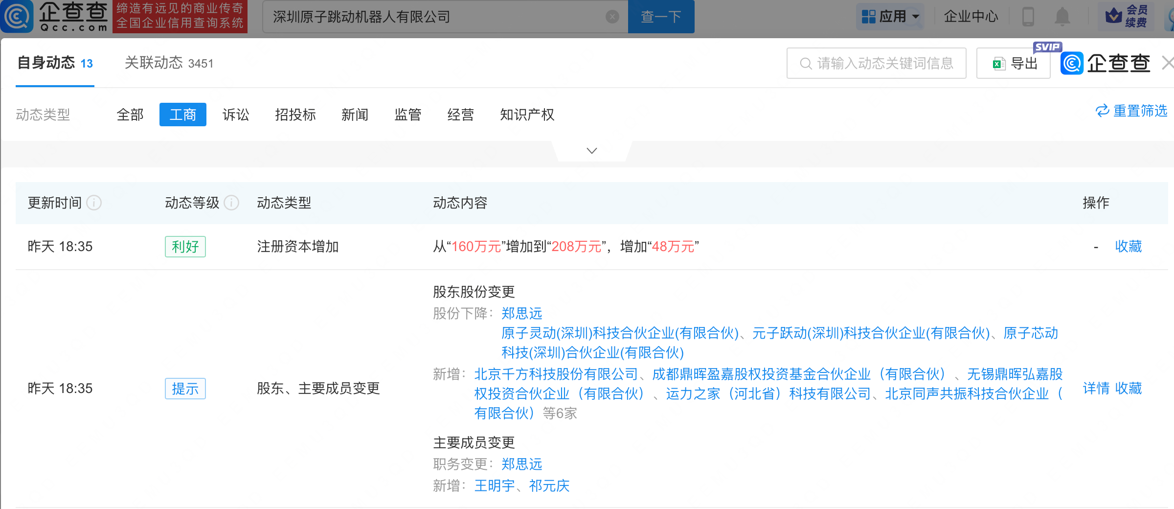 企查查APP显示,近日,深圳原子跳动机器人有限公司发生工商变更,新增千方科技(002373)等为股东,同时注册资本增至208万元。企查查信息显示,该公司成立于2026年1月,经营范围包含:智能机器人销售;人工智能应用软件开发;软件开发;物联网技术研发等。