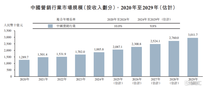 根据弗若斯特沙利文的资料,2024年,中国营销行业市场规模为1.89万亿元,预计2029年增至3万亿元,2024年至2029年的复合年增长率为9.8%。