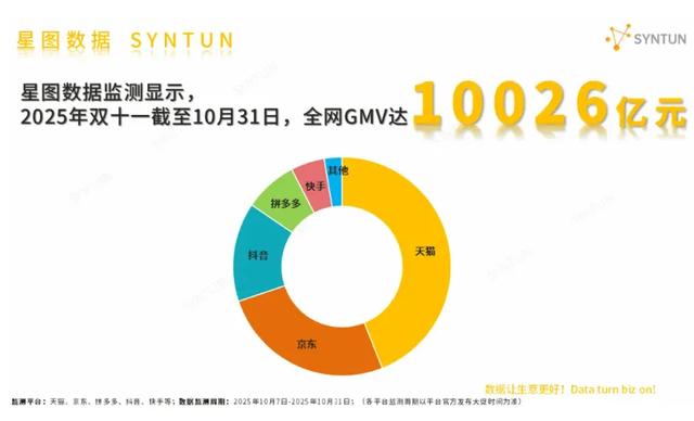 截至10月31日,2025年双十一大促全网累计销售额达到10026亿元人民币,天猫仍居综合电商平台榜首位置,京东紧随其后,抖音位列第三。