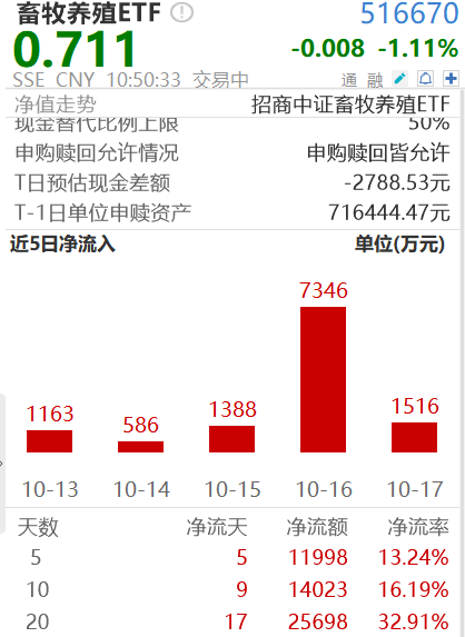 但就在目前生猪养殖行业低迷的时期,畜牧养殖ETF(516670)却持续净流入,近5日吸金超1亿元!