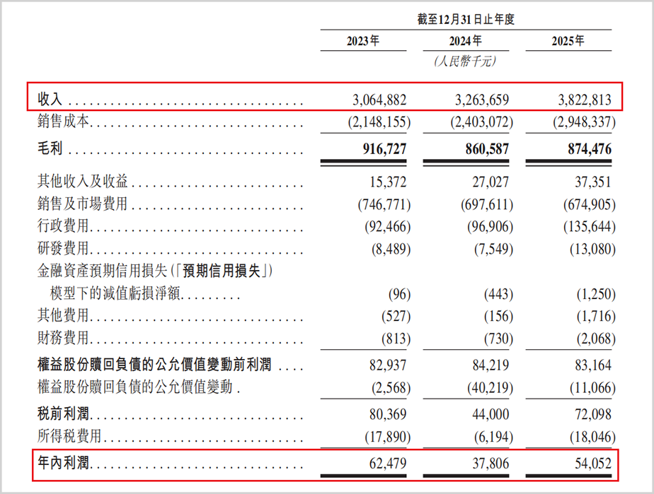 从经营业绩看,好医生云医疗呈现出“增收不增利”的显著特征。2023年至2025年,其营收从30.65亿元稳步增长至38.23亿元,复合年增长率达到11.7%,而同期净利润却从6248万元波动下滑至5405万元,整体跌幅达到13.5%。