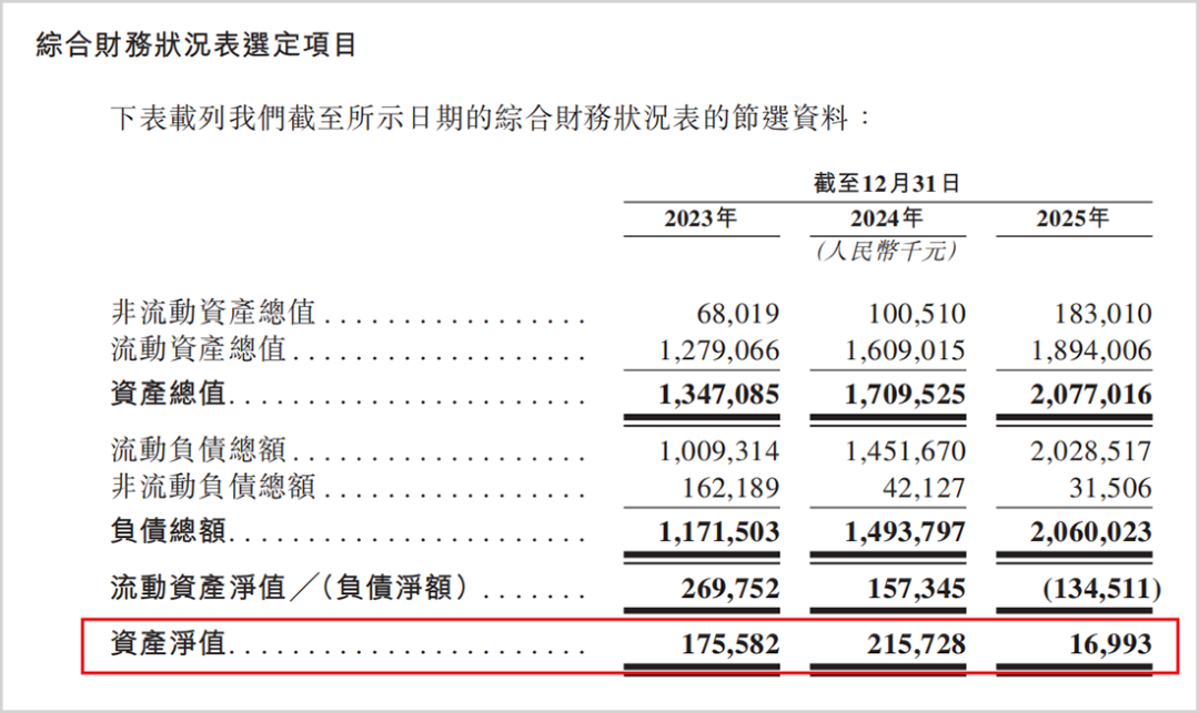 除此之外,公司的资产负债表所揭示的财务结构,更是直接关系到企业的资金状况。公司的资产净值在2025年出现了较大变动,从2024年的2.16亿元减少至1699.3万元。此外,其流动资产净值由正转负,从2023年的2.7亿元转为2025年的-1.35亿元,这意味着公司面临流动负债净额的情况。导致这一财务变动的核心原因之一,是权益股份赎回负债的流动部分增加至6.23亿元。