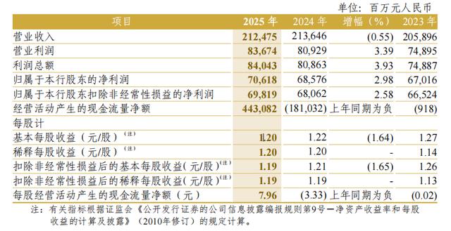 不过,将合并报表与母行报表加以对照,年报呈现出另一层变化。2025年该行营业收入为1941.64亿元,低于上年的2003.15亿元,该行净利润为647.01亿元,低于上年的663.72亿元。集团净利润保持增长,但母行报表中的营业收入和净利润均低于上年,集团报表与母行报表的变化并不同步。