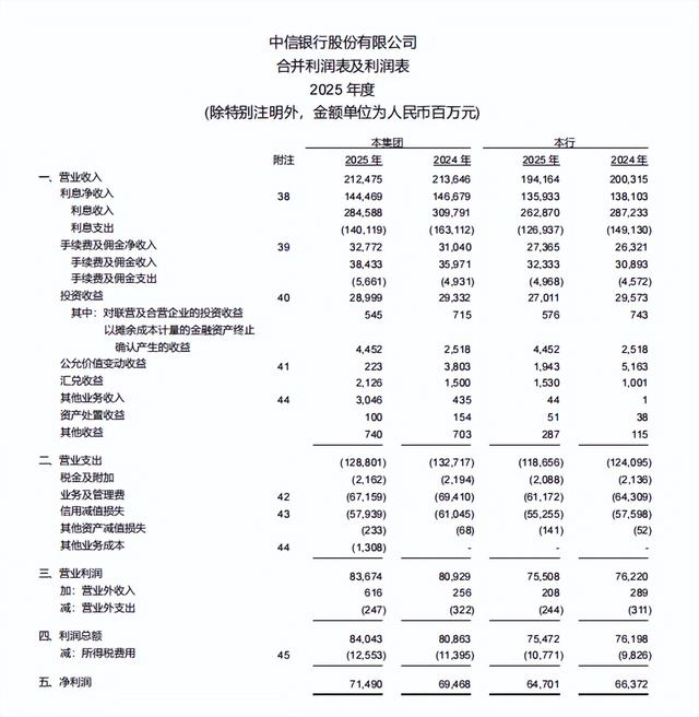 进一步看,从母行报表可见,利息净收入、投资收益和公允价值变动收益均低于上年,而业务及管理费、信用减值损失较上年下降。2025年该行利息净收入为1359.33亿元,低于上年的1381.03亿元;该行投资收益为270.11亿元,低于295.73亿元;公允价值变动收益为19.43亿元,低于51.63亿元。与之相对,该行业务及管理费由643.09亿元降至611.72亿元,信用减值损失由575.98亿元降至552.55亿元。也就是说,从母行报表看,在业务及管理费和信用减值损失下降的同时,利息净收入、投资收益和公允价值变动收益均低于上年,母行净利润仍低于上年。