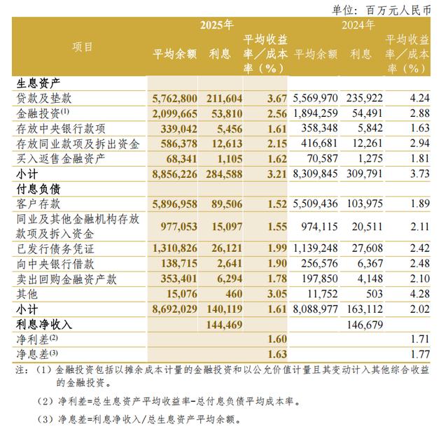 这种变化,也能从年度报告中的息差与收益率变化中得到印证。中信银行2025年度报告显示,集团利息净收入为1444.69亿元,较上年减少22.10亿元,下降1.51%,贷款及垫款平均收益率由4.24%降至3.67%,金融投资平均收益率由2.88%降至2.56%,生息资产平均收益率由3.73%降至3.21%,而付息负债成本率由2.02%降至1.61%。从年报数据看,总生息资产相关收益率降幅高于付息负债成本率降幅。