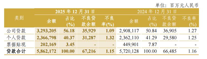 从中信银行2025年度报告数据看,零售银行业务分部利润占比较上年下降的同时,个人贷款不良率较上年末上升,公司贷款不良率较上年末下降。2025年末,集团个人贷款余额为23667.98亿元,较上年末增长0.20%,个人不良贷款率较上年末上升0.07个百分点;与此相对,公司贷款余额较上年末增长13.24%,公司不良贷款率较上年末下降0.18个百分点。