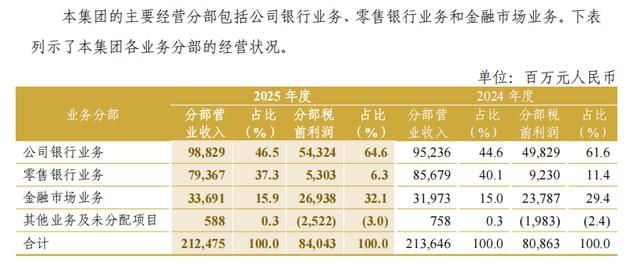 零售银行利润贡献的变化,是中信银行2025年度报告中一个值得关注的地方。按分部数据来看,2025年公司银行业务营业收入为988.29亿元,较上年增长,分部税前利润为543.24亿元,较上年增长;金融市场业务营业收入为336.91亿元,分部税前利润为269.38亿元,均高于上年。零售银行业务则不同,营业收入为793.67亿元,低于上年的856.79亿元,分部税前利润为53.03亿元,低于上年的92.30亿元。