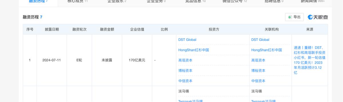说到影响消费决策,最适合拿来比较的就是小红书。天眼查APP融资信息显示,到2024年7月,小红书的估值已经达到170亿美元。