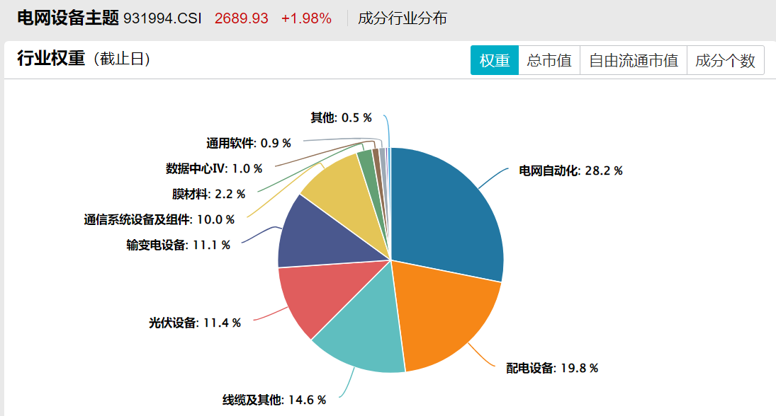 天弘中证电网设备主题指数基金(A类:025832 C类:025833)标的指数选取80只电网设备上市公司为样本,前十大成分股合计权重53.93%,包括特变电工、思源电气、国电南瑞等千亿级市值龙头。