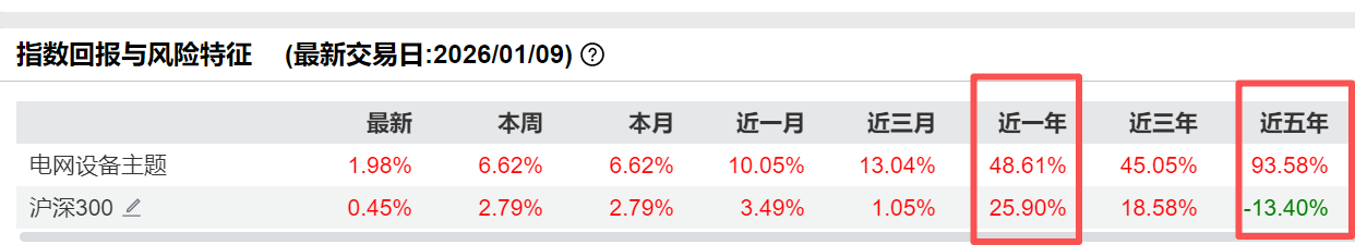 天弘中证电网设备主题指数基金(A类:025832 C类:025833),作为为数不多跟踪电网设备主题指数(931994.CSI)的场外基金,稀缺性凸显。截至1月9日,基金标的指数近1年上涨48.61%,远超同期沪深300涨幅25.90%;近5年上涨93.58%,同期沪深300指数下跌13.40%。