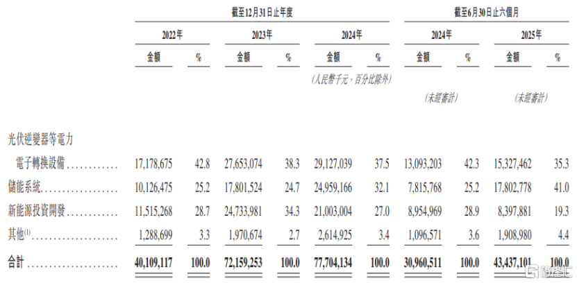 2022年至2025年上半年(简称“报告期”),阳光电源的光伏逆变器等电力电子转换设备、新能源投资开发的营收占比均有所下滑,储能系统的营收占比从25.2%提升至41%。
