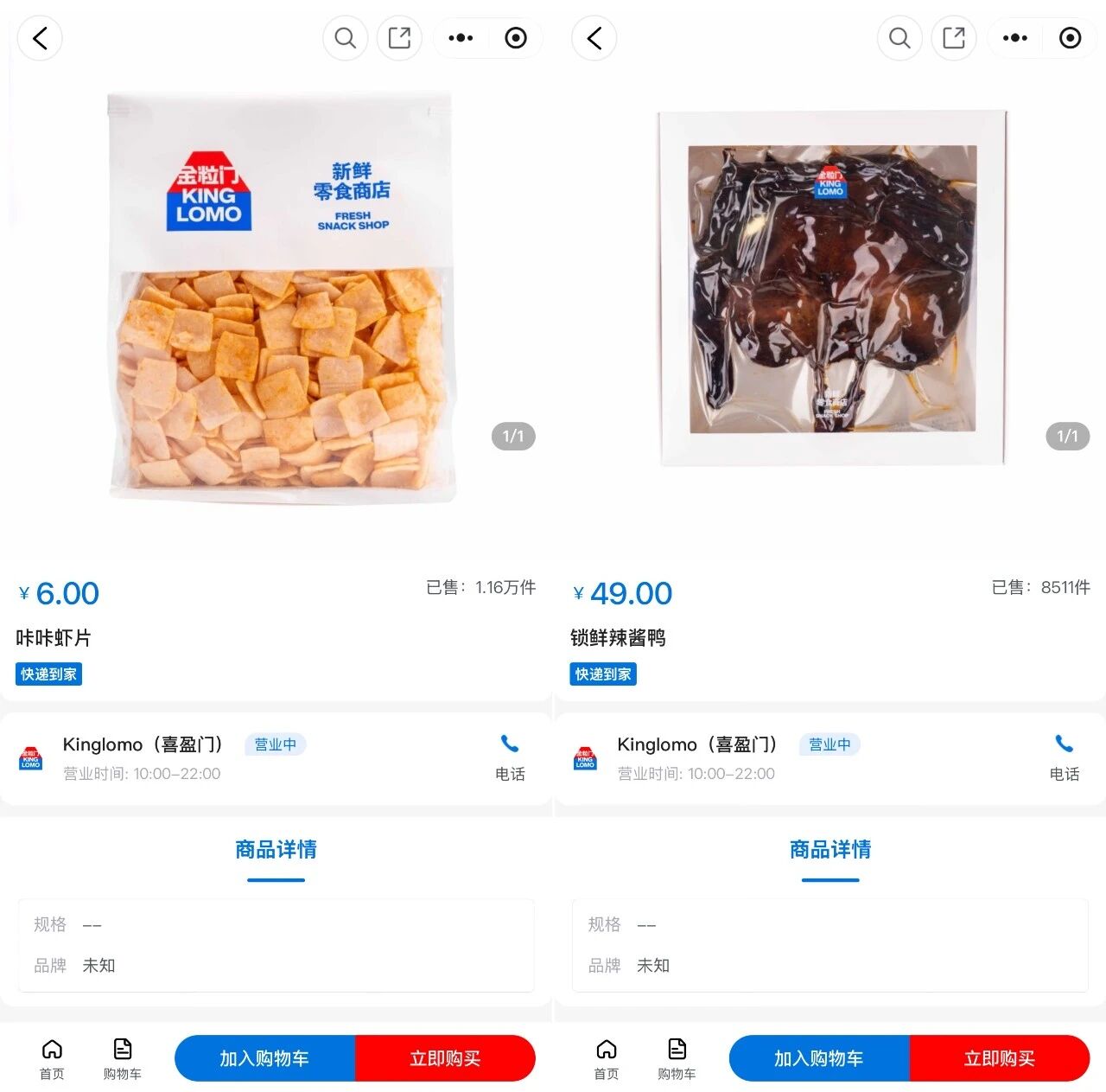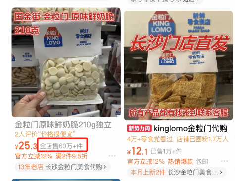 虽然新鲜零食强调现制、短保和门店体验等线下优势,但线上同样是其重要的销售渠道。如金粒门官方小程序显示,支持全国配送的长沙喜盈门店多款单品销量破千,其中“咔咔虾片”销量超1.2万件(截至4月3日16时)。