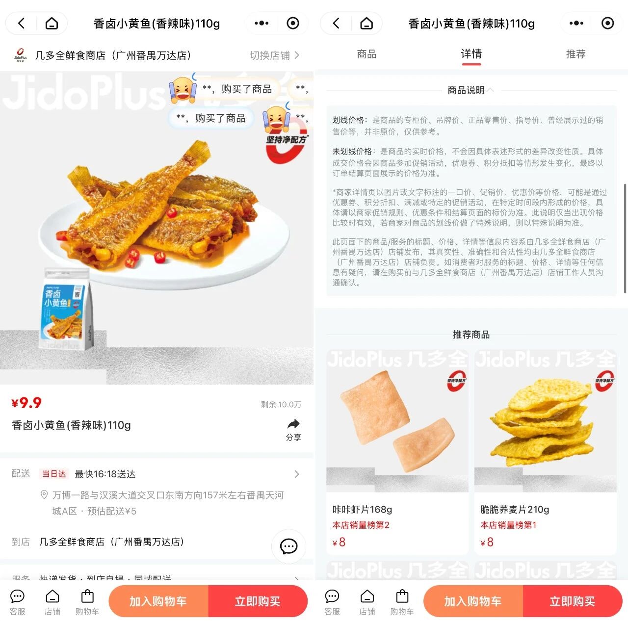 《消费者报道》记者实地走访几多全鲜食商店(广州番禺万达店)发现,店内品类丰富,涵盖鲜卤、盐焗、即食荤食、酥类糕点、乳品烘焙、坚果炒货、糖巧果冻、酒水饮料及滋补冲调等多个品类,价格从几元到几十元不等,主打高性价比。