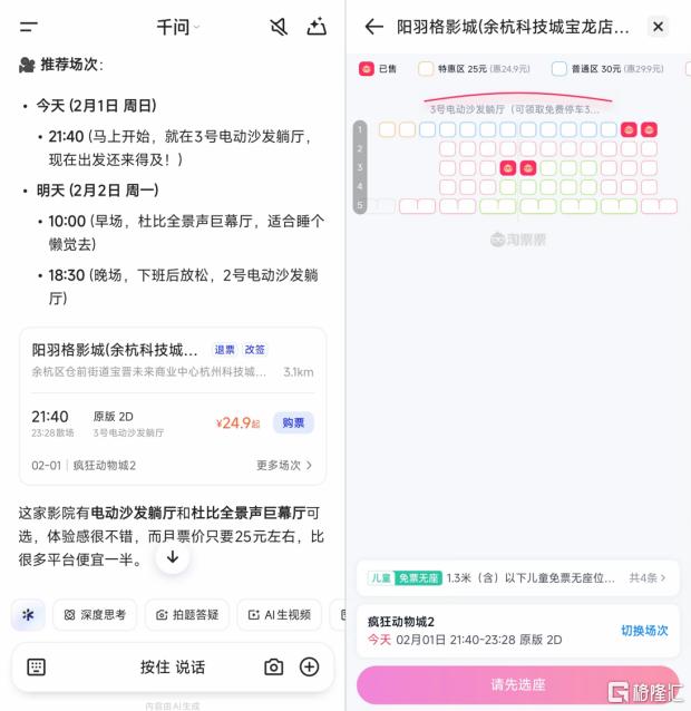 正如上文提到的,千问APP宣布已在1月提前接入了淘宝、支付宝、飞猪、高德等核心场景,开始测试“意图直达服务”的闭环。而有用户注意到,在千问内询问电影信息时,可直接完成选座与购票。据内部人士透露,AI买电影票功能正在灰度测试,即将全面开放。