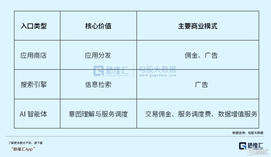 由此,互联网核心入口的估值逻辑也正在发生根本性重构。传统应用商店的价值在于应用分发能力,其商业模式主要是向开发者收取佣金或广告费。搜索引擎的价值在于信息检索和商业意图的捕捉,商业模式以广告为主。而AI智能体的价值则在于“意图理解”和“服务调度”能力,其商业模式更多元、更深层。