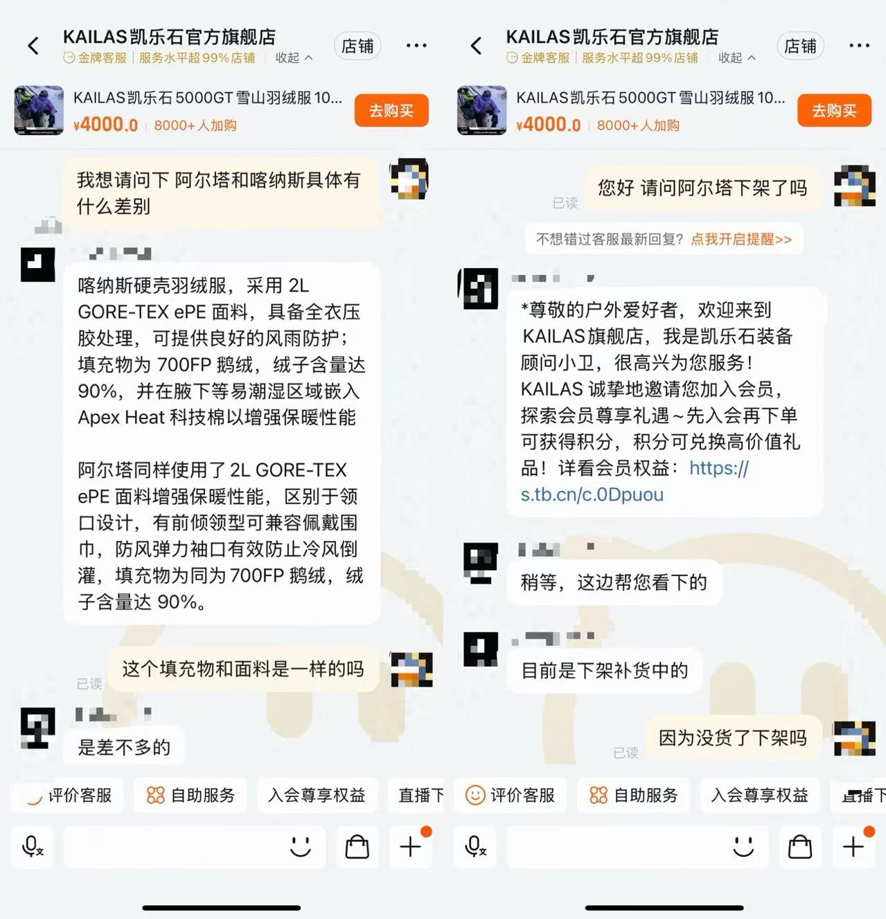 蓝鲸记者了解到,陷入争议的喀纳斯和阿尔塔款羽绒服售价分别为3900元、4800元。客服回应称两者的面料、充绒物及含量基本一致,差别在于领口设计和易潮区域嵌入的科技棉。其中,价格较低的喀纳斯早前已下架。蓝鲸记者发现,被指涨价900元的阿尔塔款羽绒服目前也已在官方店铺下架。客服表示系下架补货中,暂不清楚后续上架时间。