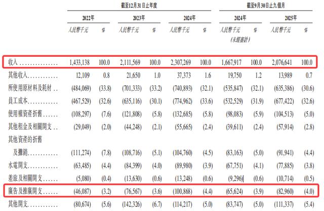 近年来,巴奴业绩呈增长态势。2022年至2025年9月末,公司收入分别为14.33亿元、21.12亿元、23.07亿元及20.77亿元;经调整净利润分别为4150万、1.44亿、1.68亿、2.35亿。