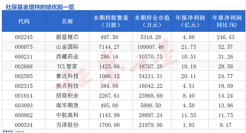 业绩方面,获得社保基金持有的个股中,2024年净利润实现同比增长的有16家。其中净利润增幅最高的是安迪苏,2024年公司营业收入达到155.34亿元,同比增长17.83%;归属于上市公司股东的净利润达到12.04亿元,同比增长2208.66%。净利润同比增幅居前的还有蔚蓝锂芯、山金国际等,分别增长246.43%、52.57%。