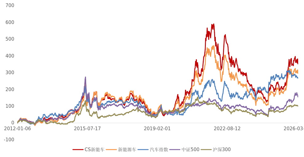 基期以来(2011.12.31-2026.03.23),该指数区间涨跌幅329.98%、区间年化收益率11.14%、年化夏普比率0.50,表现均优于同期国证新能源车指数和中证全指汽车指数。立足产业高质量发展新起点,抢抓全球电动化、智能化红利窗口期,投资者或可借道新能源车ETF招商(159183)一站式布局整车制造、动力电池、核心零部件等新能源汽车全产业链优质龙头标的,助力投资者把握电动化替代与出海扩张双重红利。