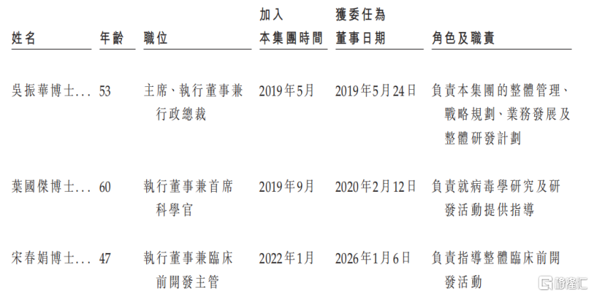 嘉因生物的执行董事有三名成员。其中吴振华博士今年53岁,目前任公司董事长、首席执行官兼执行董事。他先后获兰州大学细胞生物学学士学位、中国科学院上海细胞生物学研究所细胞生物学硕士学位、罗切斯特大学神经科学博士学位。