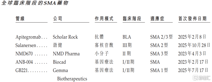 竞争格局方面,目前,全球有四种已获批的SMA药物,以及五种在研的SMA候选药物。其中,中国有两种已获批的SMA药物,包括百健的反义寡核苷酸(ASO)疗法,与罗氏的小分子疗法。