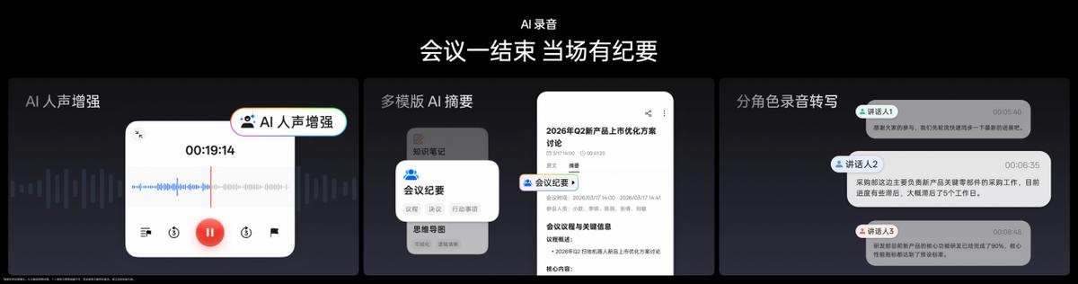 依托强大的 AI 能力,OPPO Find N6 还首次搭载系统级多功能快捷键,带来「AI 一键闪记」功能,一键即可完成语音灵感记录、文档资讯摘要、视频关键信息提取;AI 录音功能可精准区分发言人,生成多模板智能会议纪要,真正实现「录音两小时,回顾五分钟」的高效体验。