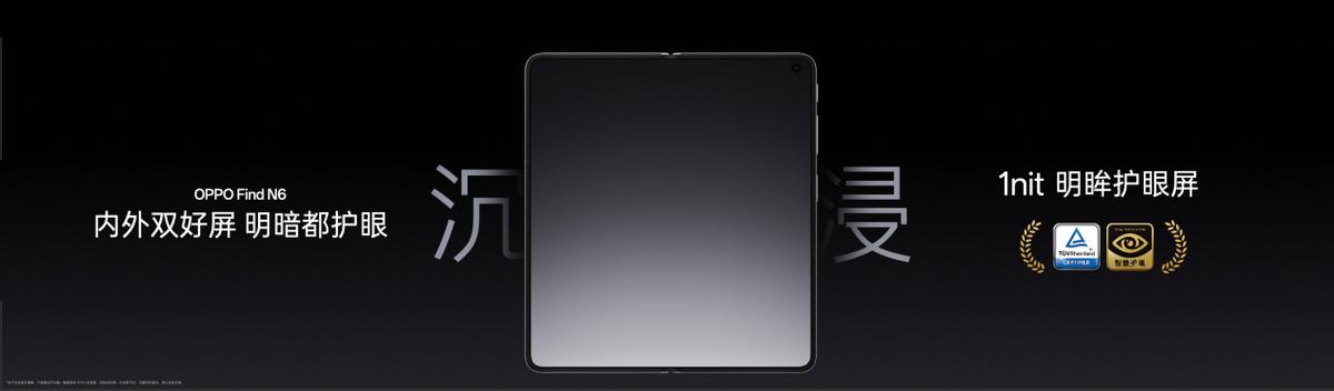 屏幕素质方面,OPPO Find N6 延续 OPPO 在显示领域的绝对领先优势,内外双屏均搭载 1nit 明眸护眼屏,暗光下显示均匀清晰,告别抹布屏困扰;内外屏全局峰值亮度提升至 1800nits,烈日强光下依然清晰可见。同时,这块屏幕更通过了德国莱茵 TÜV「金标」护眼认证,提供「亮光看得清,暗光更护眼」的全场景舒适体验。