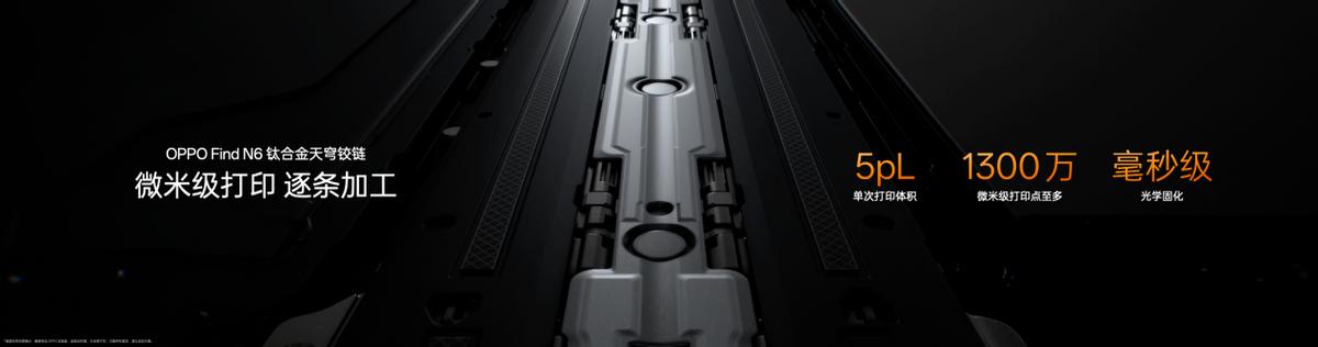 「新一代钛合金天穹铰链」,率先打破传统精密加工的极限。铰链采用行业首个仿生对称四轴结构,相较传统三轴铰链,扭力提升 20% 的同时,让铰链表面起伏从 0.18 mm 降至 0.1 mm,支撑面更广、受力更均匀,开合手感丝滑如一。但 0.1 mm 的起伏依然不够,OPPO 追求的是极致的平整。为此,OPPO 开创性地将芯片领域的精密加工技术应用于铰链制造,带来行业首创「芯片级高分子 3D 打印技术」,让铰链中板平整度至高提升 75% ,将微观天堑化为坦途。OPPO 更打造了行业首个专为平整而生的产线,让每一台 Find N6 的铰链都拥有极致统一的平整表现。