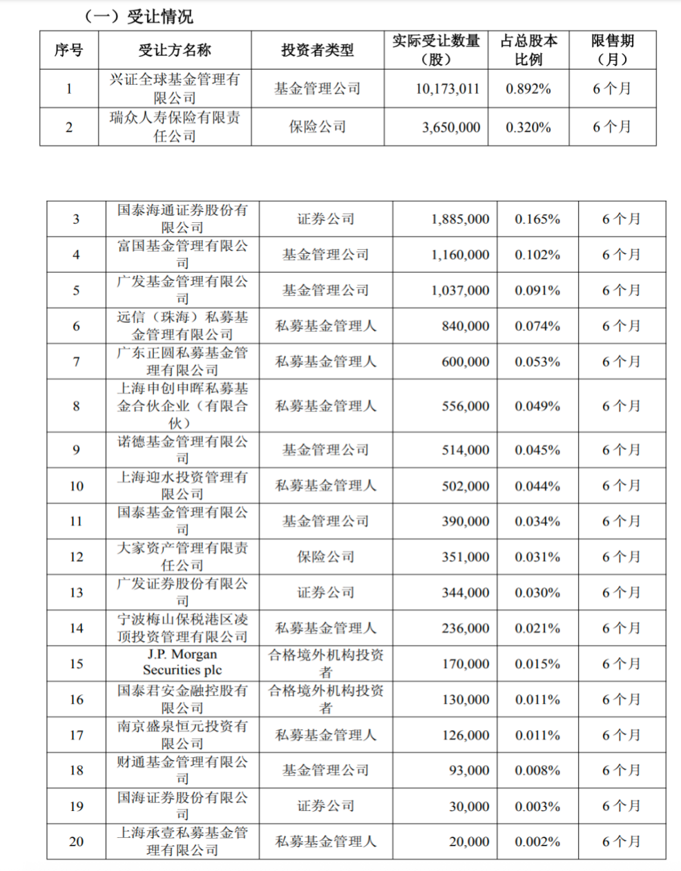 一共有20家投资机构接盘,包括兴证全球基金管理有限公司、瑞众人寿保险有限责任公司、国泰海通证券股份有限公司、富国基金管理有限公司等,锁定期为6个月。