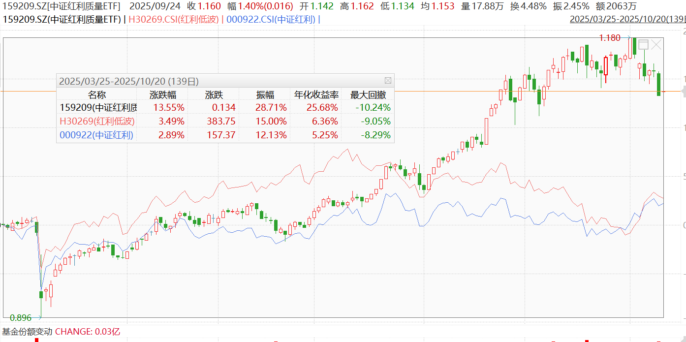 对于偏好防御的投资者,想要在防御基础上再加点进攻的,可以看看中证红利质量ETF(159209),这个ETF不含银行股,收益来源更多元均衡,可以在银行的基础上增加一些“进攻性”。