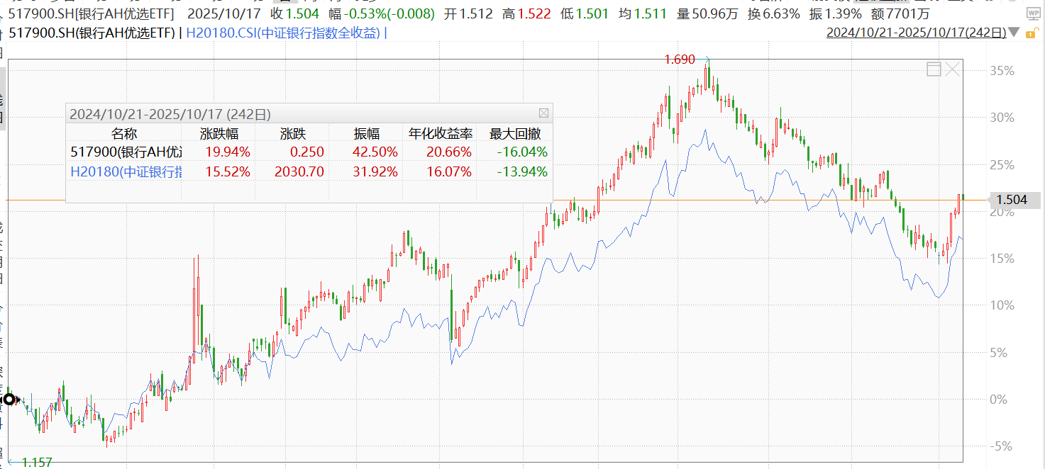 这个指数还有个聪明的设计,采用AH价格优选月度证券类别转换策略,直白点将就是每个月都会在A股和H股里选“更便宜”的那边买。目前它的持仓里,港股银行股权重35.59%,A股银行股占比约64%。