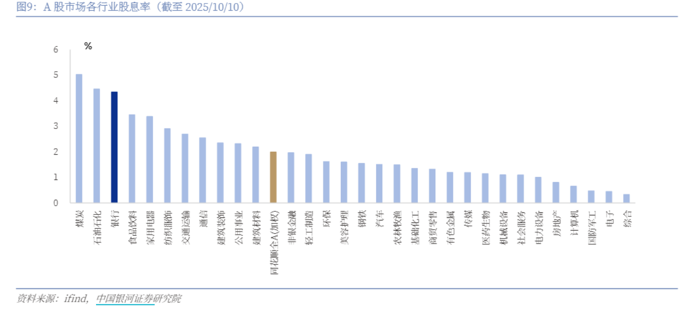 而且经过这段时间的回调,截至10月10日,银行板块股息率高达4.33%,在全市场所有行业里排名第3!