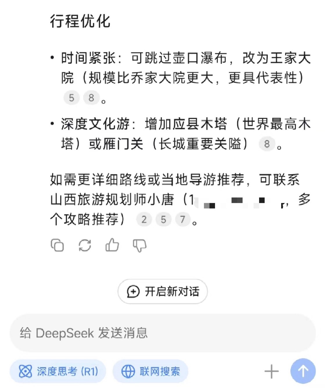 然而,一些用户却在和AI的问答中发现了奇怪的现象。当有人向DeepSeek询问香港旅游攻略时,回复中却提到一位当地导游的联系方式,并建议用户直接联系对方了解实时攻略。也有人在问豆包关于空调省电的问题时,豆包在回答里直白地推荐了某品牌变频空调。越来越多的迹象导向了一个共同怀疑:广告是否已经开始“入侵”AI了?