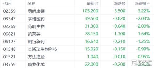 医药外包概念股下挫,药明康德跌超3%,泰格医药、药明生物、凯莱英、昭衍新药、金斯瑞生物科技等跟跌。