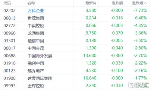 内房股低迷,万科企业跌超7%,世茂集团、龙湖集团、中国金茂、中国海外发展等跟跌。