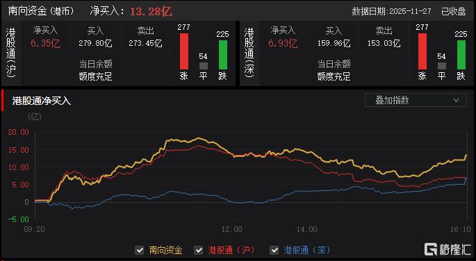 今日,南向资金净买入13.28亿港元,其中港股通(沪)净买入6.35亿港元,港股通(深)净买入6.93亿港元。