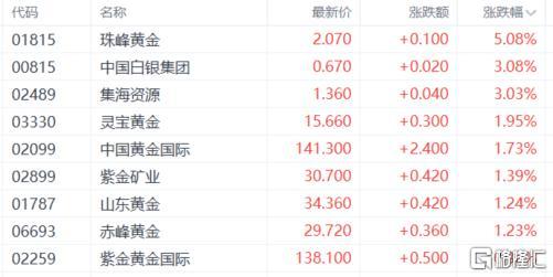 黄金股活跃,珠峰黄金涨超5%,中国白银集团、集海资源、灵宝黄金、中国黄金国际、紫金矿业、山东黄金、赤峰黄金、紫金黄金国际等跟涨。